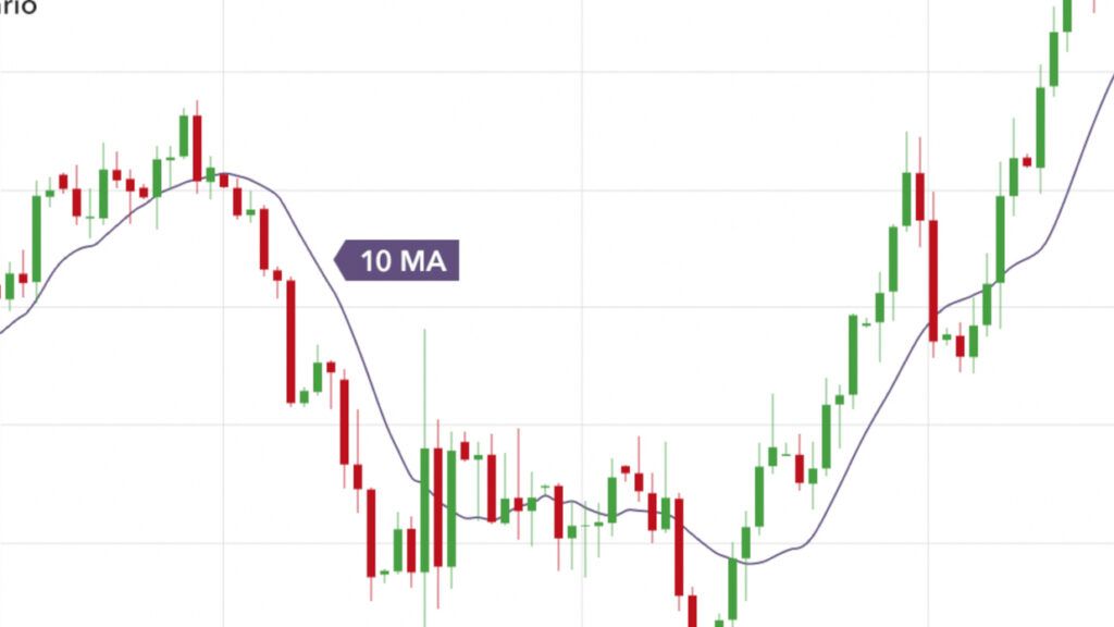Un ejemplo es la media móvil, que es simplemente una línea donde cada punto se calcula con el valor promedio de los periodos que queramos. Si por ejemplo elegimos una media móvil de 9 periodos cada punto se obtiene con el promedio de los 9 precios anteriores. Es decir que se dibuja una línea de promedios, y se hace así para suavizar el ruido que provocan factores a corto plazo como algunas noticias o manipulaciones. La media móvil resume mejor la información general y es útil a nivel visual.