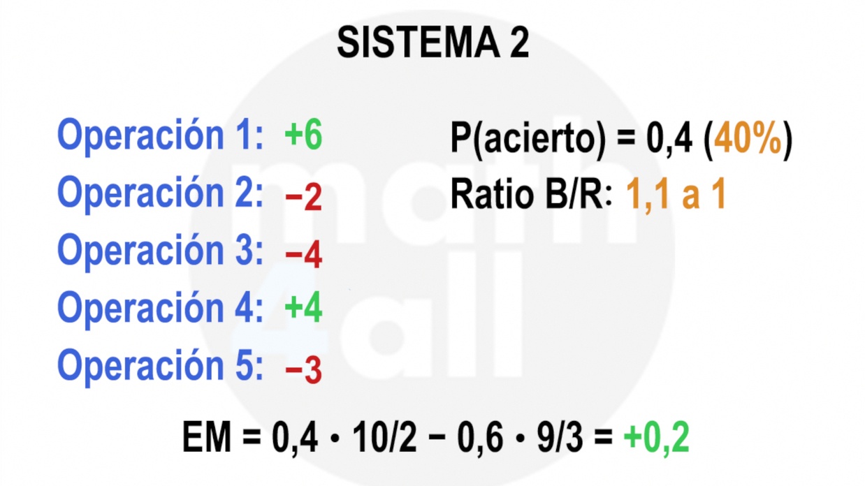 Recuerda siempre que un sistema es ganador solo cuando lo es su esperanza matemática, y no alguna de las dos variables por separado.
