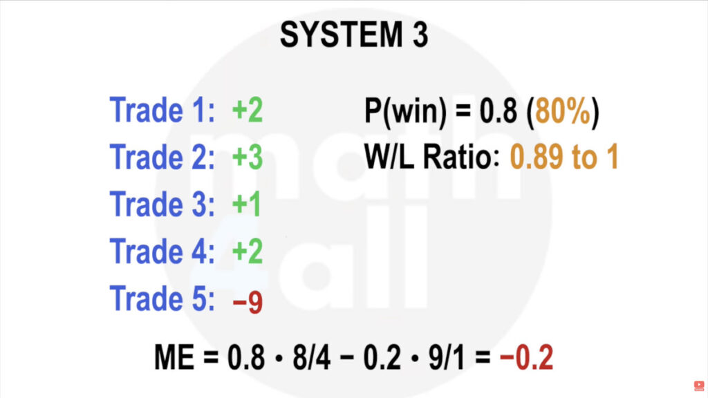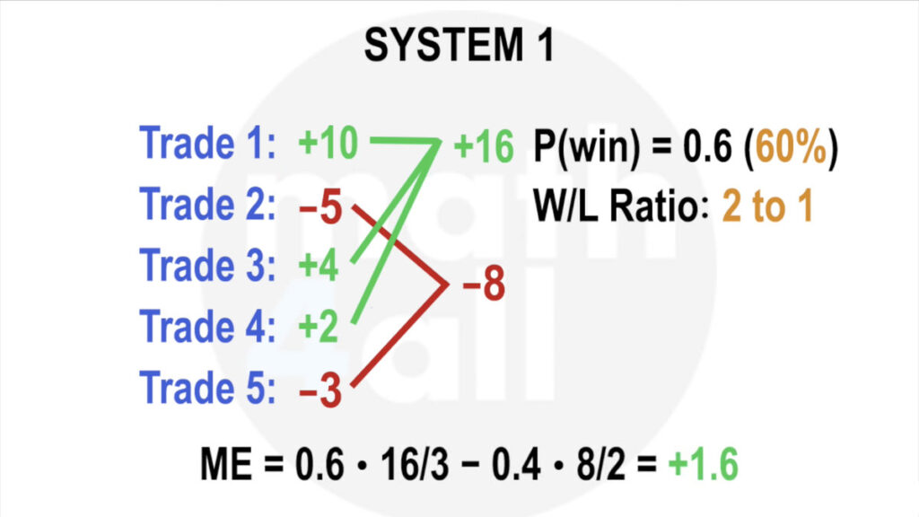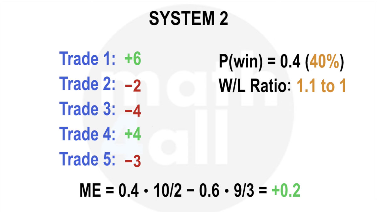 Imagine your system was like flipping a coin with 2 rules. If it’s heads, they pay you another coin, but if it’s tails, you lose your coin. This means your risk-reward ratio is 1 to 1 (1 coin you can win for every 1 coin you can lose). Since the probability of getting heads is 50%, the law of large numbers ensures that after many flips, you would have a win rate close to that value, and since the prize when you win is the same as what you lose when you lose, you would have a system that neither wins nor loses. Mathematical expectancy: 0.
