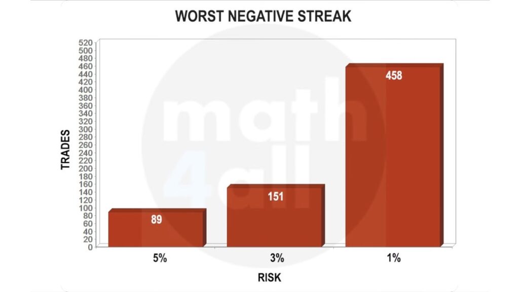 For this, I want you to see a chart where you can see how many consecutive negative trades you need to go broke with some common risks. Notice that a low risk allows you a much larger margin for error.