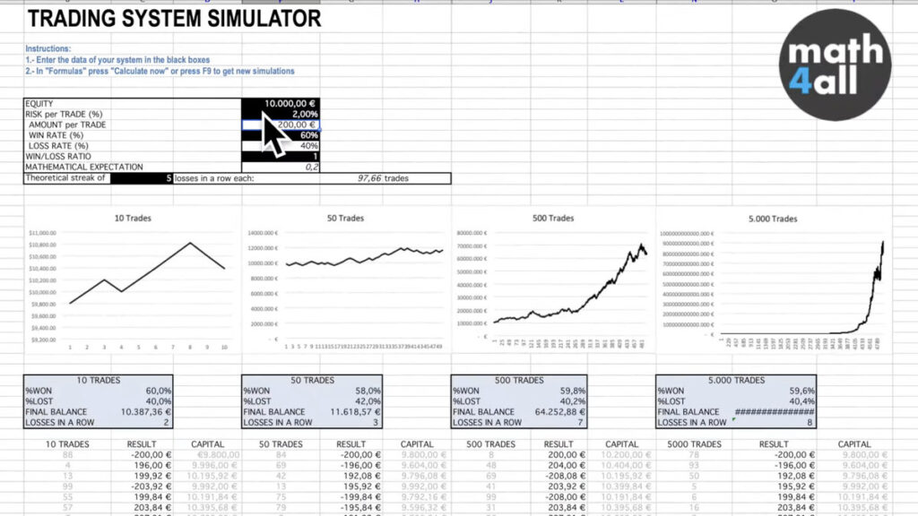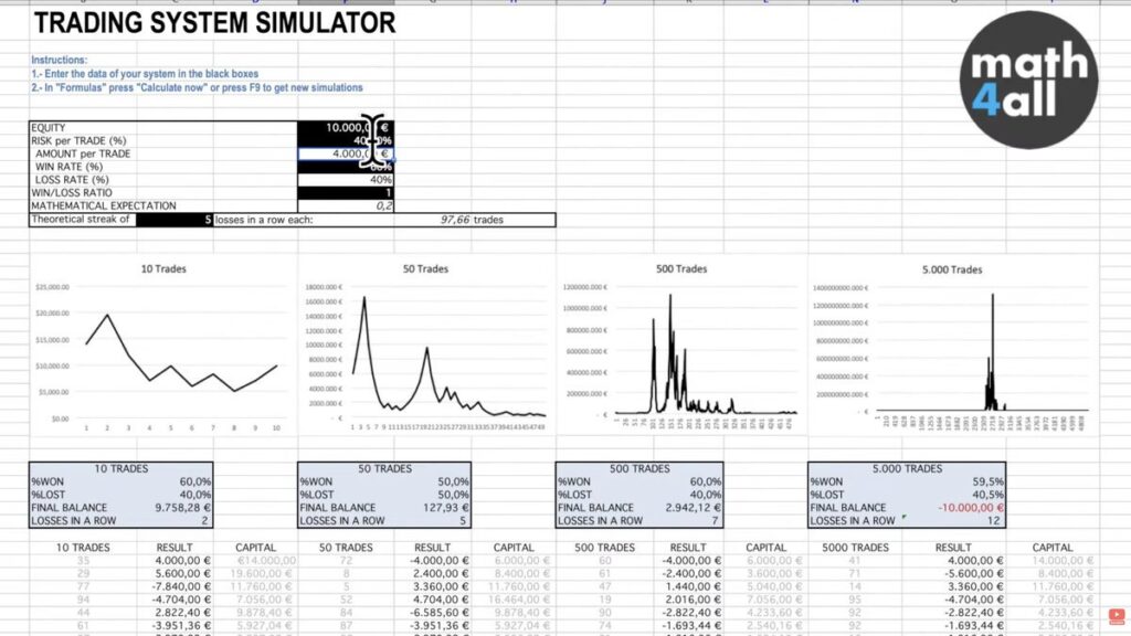 To fully convince you, I’ve created a trading simulator where you can test all these concepts. I’m going to input a system that is profitable on paper, but with a quite high risk per trade, for example, 40%. You can see that what seemed like a winner turns out not to be. Surprise!